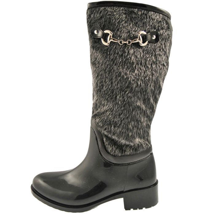 Description: Γαλότσα σε μαύρη απόχρωση του οίκου Anna Fidanza με γκρι σκούρα γούνα στην περιφέρεια της γάμπας και διακοσμητική αλυσίδα στο πλαϊνό μέρος. Το ύψος του τακουνιού είναι 4 cm, η περιφέρεια της γάμπας 40 cm ενώ το ύψος της 33 cm. O δερμάτινος πάτος του παπουτσιού και η σόλα από εύκαμπτο λάστιχο σας υπόσχονται ένα πολύ άνετο και ξεκούραστο περπάτημα. Ιδανική για τις γυναίκες που θέλουν να είναι μέσα στη μόδα και τις βροχερές μέρες."